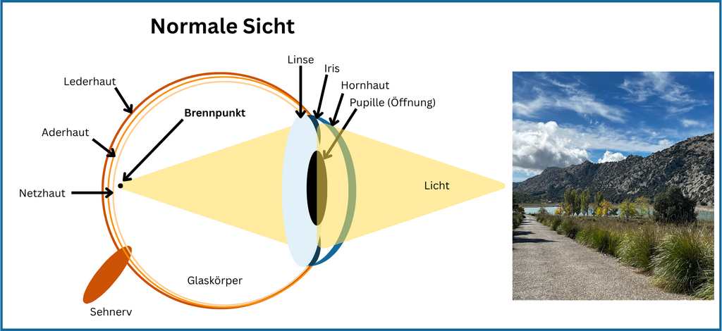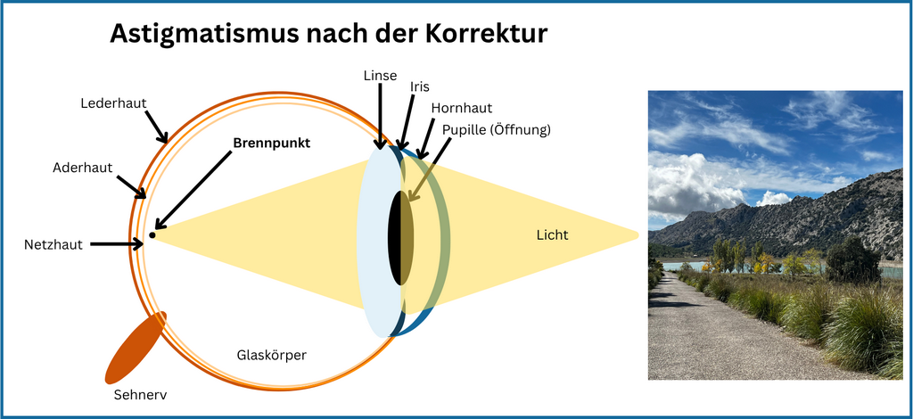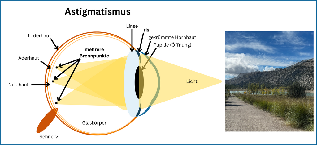 Das hat zur Folge, dass einfallendes Licht nicht in einem Punkt gebündelt wird. Stattdessen entstehen mehrere Brennlinien. Für das Gehirn bedeutet das: Das Bild wird nicht klar, sondern verzerrt oder verschwommen wahrgenommen. Gerade Linien können leicht gebogen wirken, und Kontraste erscheinen unschärfer: Bilder werden auf der Netzhaut unscharf oder verzerrt dargestellt – unabhängig davon, ob es sich um nahe oder entfernte Objekte handelt.